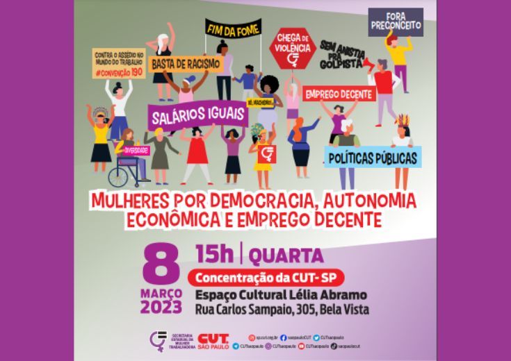Neste 8 de março, Dia Internacional da Mulher, a CUT, centrais e movimentos de mulheres levarão essa e outras pautas às ruas em diversas cidades do país. Há ainda a previsão do lançamento de um conjunto de medidas voltadas às mulheres pelo governo federal neste dia. (Veja ao final da matéria onde serão realizados atos no dia 8 de março)