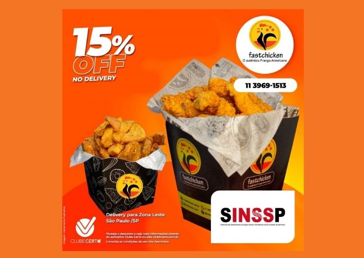 Humm bateu aquela fome?! Então corre pra Fastchicken, somente aqui no Clube Certo SINSSP o servidor filiado ao sindicato garante 15% OFF para comer o mais autêntico frango americano. Mas atenção, desconto válido para delivery na zona leste, São Paulo/SP.