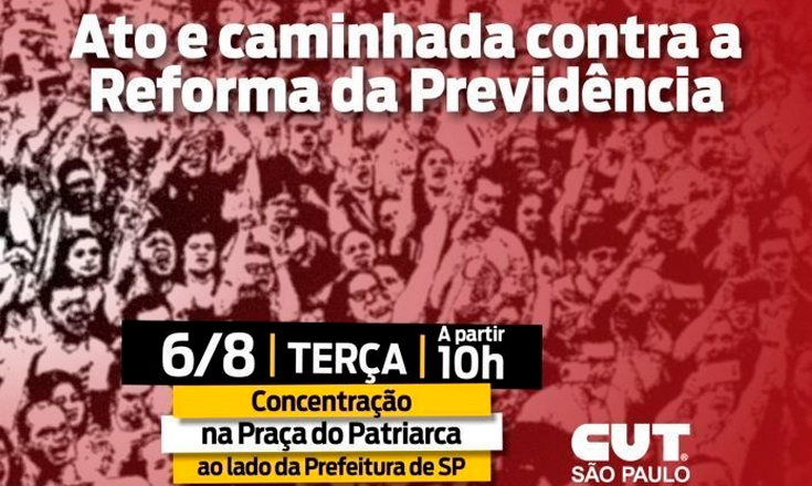 Dentro do calendário de mobilização contra a Reforma da Previdência, a CUT convoca para a próxima terça (6) um ato e caminhada pelas ruas do centro de São Paulo. A concentração terá início às 10h na Praça do Patriarca.