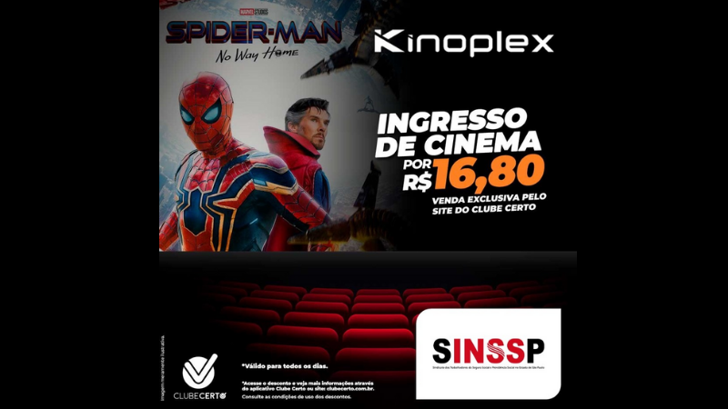 Nesta quinta-feira (16) tem estreia no cinema, Spider Man no Way Home! E aqui no Clube Certo SINSSP quem é servidor filiado ao Sindicato vai encontrar descontos imperdíveis que garante seu ingresso com até 55% OFF, com venda exclusiva pelo site do Clube Certo! E aí, anima um cineminha?