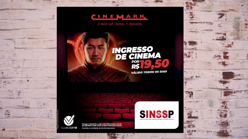O Clube Certo SINSSP traz um desconto que vai animar a sua sexta-feira e o seu final de semana. Quer saber como? Na rede de cinema Cinemark, quem é filiado ao sindicato garante ingresso por apenas R$19,50 em qualquer dia da semana, isso mesmo que você leu, R$ 19,50.