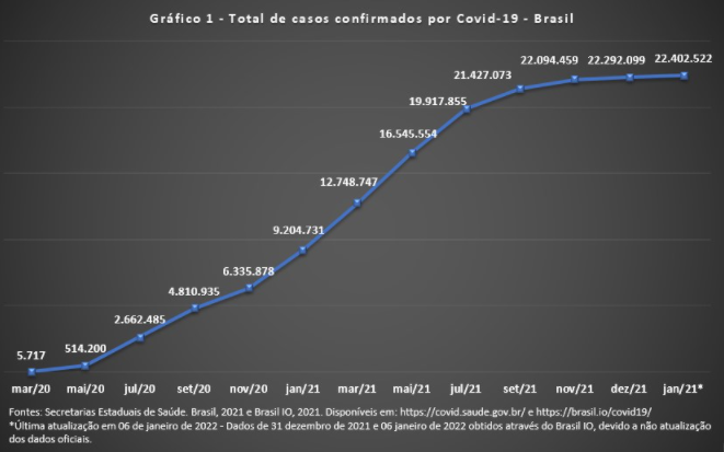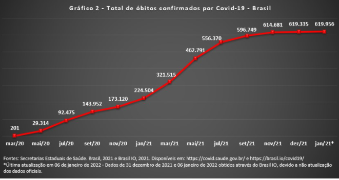 Os Gráficos 1 e 2 retratam a evolução da pandemia (atualizados e ajustados pelo Consórcio de Imprensa - IO), evidenciando que entre final de novembro de 2021 e início de janeiro de 2022, houve um aumento de 308.063 casos confirmados e 5.275 novos óbitos.