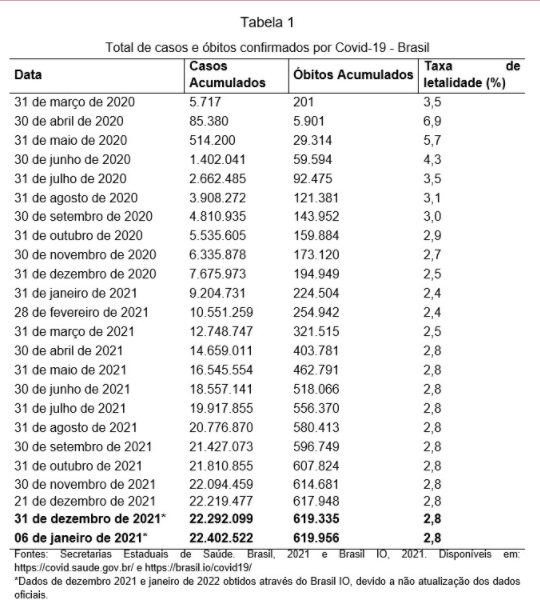 Dados atualizados do Ministério da Saúde, mostram, em 21/12/2021, um quadro com a doença instalada em todo o país: na ordem desde março de 2020, de 22.219.477 casos confirmados e 617.948 óbitos, com 2,8% de letalidade. Por outro lado, informações recentes da mídia nacional, por meio do IO, o Brasil contabilizou em 31/12/2021 22.292.099 casos confirmados e 619.335 óbitos, passando em apenas 6 dias de janeiro de 2022 para 22.402.522 casos confirmados e 619.956 óbitos em toda a população (Tabela 1).