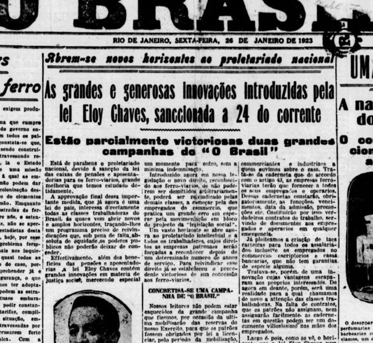 A Previdência Social remonta os tempos do segundo império, mas oficialmente seu início começa com a promulgação da Lei Elói Chaves em 24/01/1923 que consolidou a base do sistema previdenciário brasileiro com a criação da Caixa de Aposentadorias e Pensões para os empregados das empresas ferroviárias.