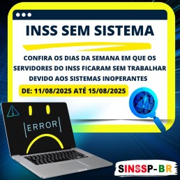 O SINSSP-BR vem a público manifestar seu profundo descontentamento diante da indisponibilidade nos sistemas do INSS que já perdura desde o dia 25/07, causando graves prejuízos à rotina de trabalho dos servidores.