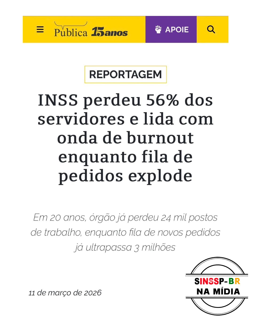 Em nota à Pública, o INSS admitiu a “redução significativa” de seu quadro de servidores e os episódios de instabilidade dos sistemas. Afirmou que foi criado um grupo de trabalho sobre o abatimento de metas e que elas foram estabelecidas “com base em critérios técnicos”. A assessoria do órgão disse que não comenta questões de saúde dos servidores e destacou ações realizadas para reduzir as filas, como mutirões e grupos de trabalho especializados. O INSS também disse não identificar prejuízos do teletrabalho e afirmou estar adotando medidas para melhorar as condições de trabalho nas unidades.