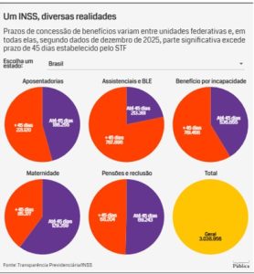 Quem necessita acionar o INSS por um benefício ou aposentadoria tem desafios diferentes a depender de onde viva. Até dezembro de 2025, o tempo médio de concessão (TMC) era de 50 dias. No entanto, há uma disparidade regional notável, com esse prazo chegando a 28 dias no Distrito Federal e a 102 dias para quem vive no Acre.