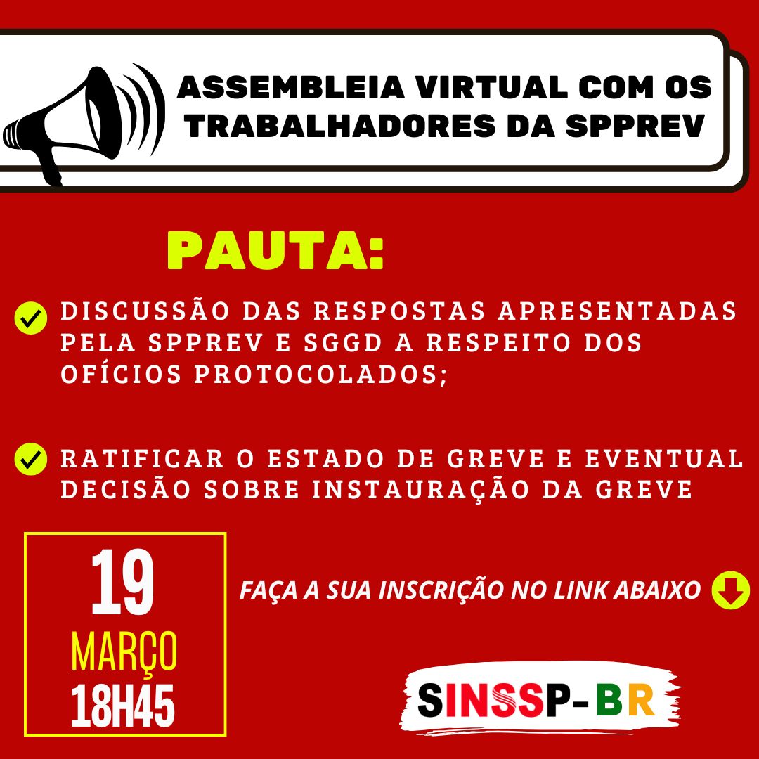 O SINSSP-BR convoca todos trabalhadores da SPPREV, filiados e não filiados, para participarem da Assembleia Geral Extraordinária Virtual, que será realizada no dia 19 de março, às 18h45 em primeira convocação e às 19h em segunda convocação.