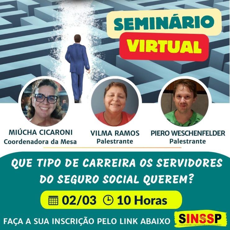Que tipo de CARREIRA os Servidores do Seguro Social querem? Para responder essa pergunta o SINSSP vai promover um Seminário virtual sobre a Carreira do Seguro Social, no próximo sábado, dia 02/03, às 10 horas, via Google Meet.
