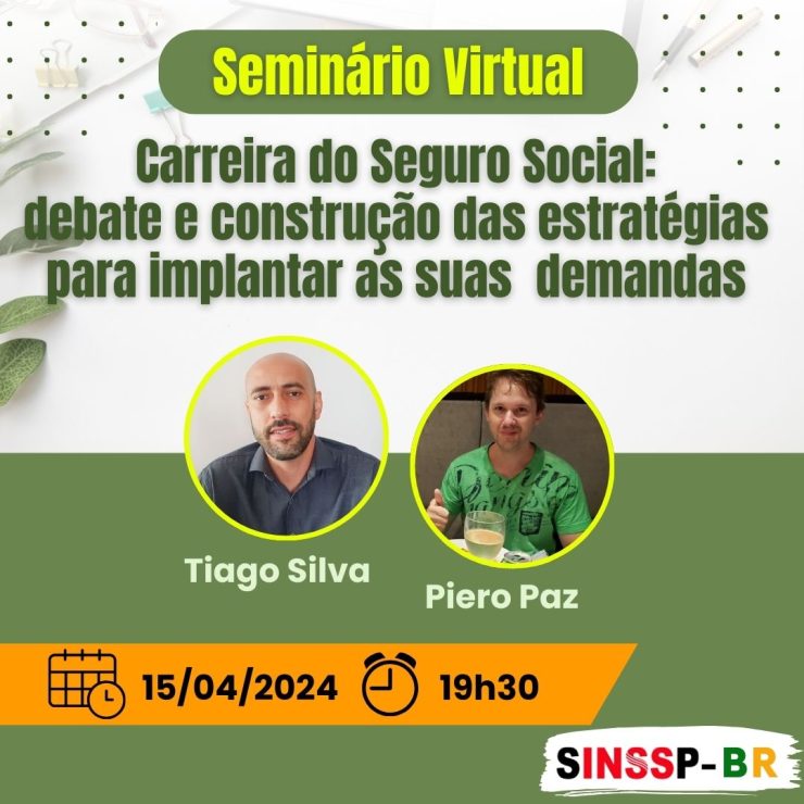 O SINSSP convida todos os servidores da Carreira do Seguro Social, técnicos e analistas, da ativa e aposentados, para o seminário virtual “Carreira do Seguro Social: debate e construção das estratégias para implantar as suas demandas”, na próxima segunda-feira (15), às 19h30, via plataforma Google Meet.