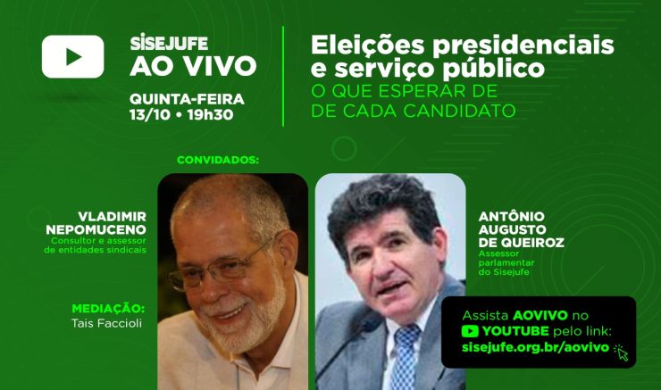 Os convidados Vladimir Nepomuceno, consultor e assessor de entidades sindicais, e Antônio Augusto de Queiroz, assessor parlamentar do SISEJUFE, vão avaliar os impactos das candidaturas de Lula e Bolsonaro, além das propostas para a população e para o funcionalismo público.
