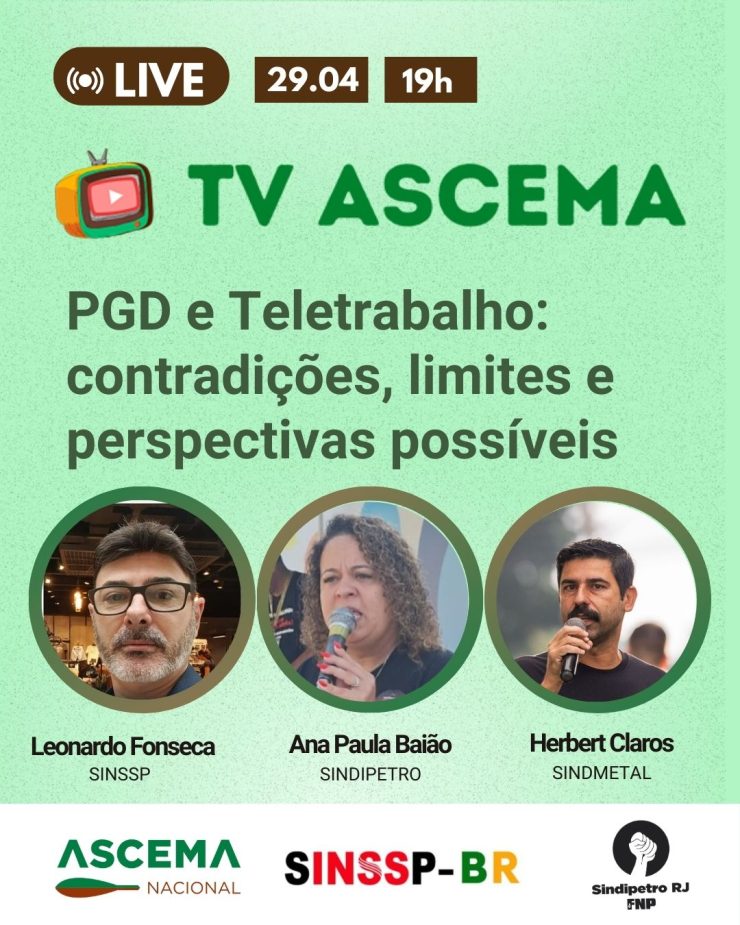 O diretor do SINSSP-BR, Leonardo Fonseca, participará de uma Live/Debate no Canal da TV Ascema, na terça-feira (29), às 19h, sobre PGD e Teletrabalho: contradições, limites e perspectivas possíveis.