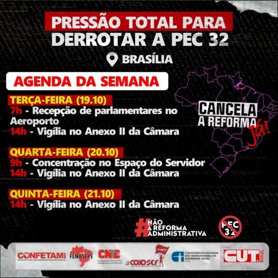 Outra data de grande impacto será o dia 28 de outubro, Dia do Servidor Público, quando espera-se uma mobilização ainda mais intensa nos Estados e Municípios. A prioridade é a realização do maior número possível de atividades, mesmo pequenas, com o objetivo de pressionar localmente os parlamentares e dialogar com a população. Em Brasília, há o indicativo de uma manifestação na Praça dos Três Poderes. Neste dia será realizada uma Live, transmissão ao vivo, com dirigentes das entidades cutistas e convidados para reafirmar a importância da derrubada da PEC 32.
