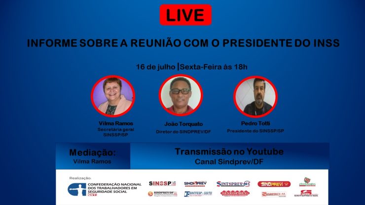 O SINSSP e os demais sindicatos filiados à CNTSS realizam uma Live Leve informativa sobre a reunião com o Presidente do INSS, Leonardo Rolim, HOJE, às 18 HORAS, com a participação do Presidente do SINSSP, Pedro Totti, e mediação da Diretora da pasta Secretaria Geral, Vilma Ramos. Os pontos de pauta discutidos na reunião foram: